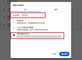 (2)在“删除浏览数据”窗口中,从“时间范围”下拉菜单中选择“时间不限”,并仅勾选“缓存的图片和文件”。
