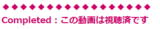 3 | 視聴ステータスメッセージ | 動画プレーヤーの上部に表示されるメッセージです。視聴済メッセージが表示されている動画を以後再視聴する際は、早送り可能です。 | 視聴未完了の場合:![]() 視聴済の場合: ![]() |