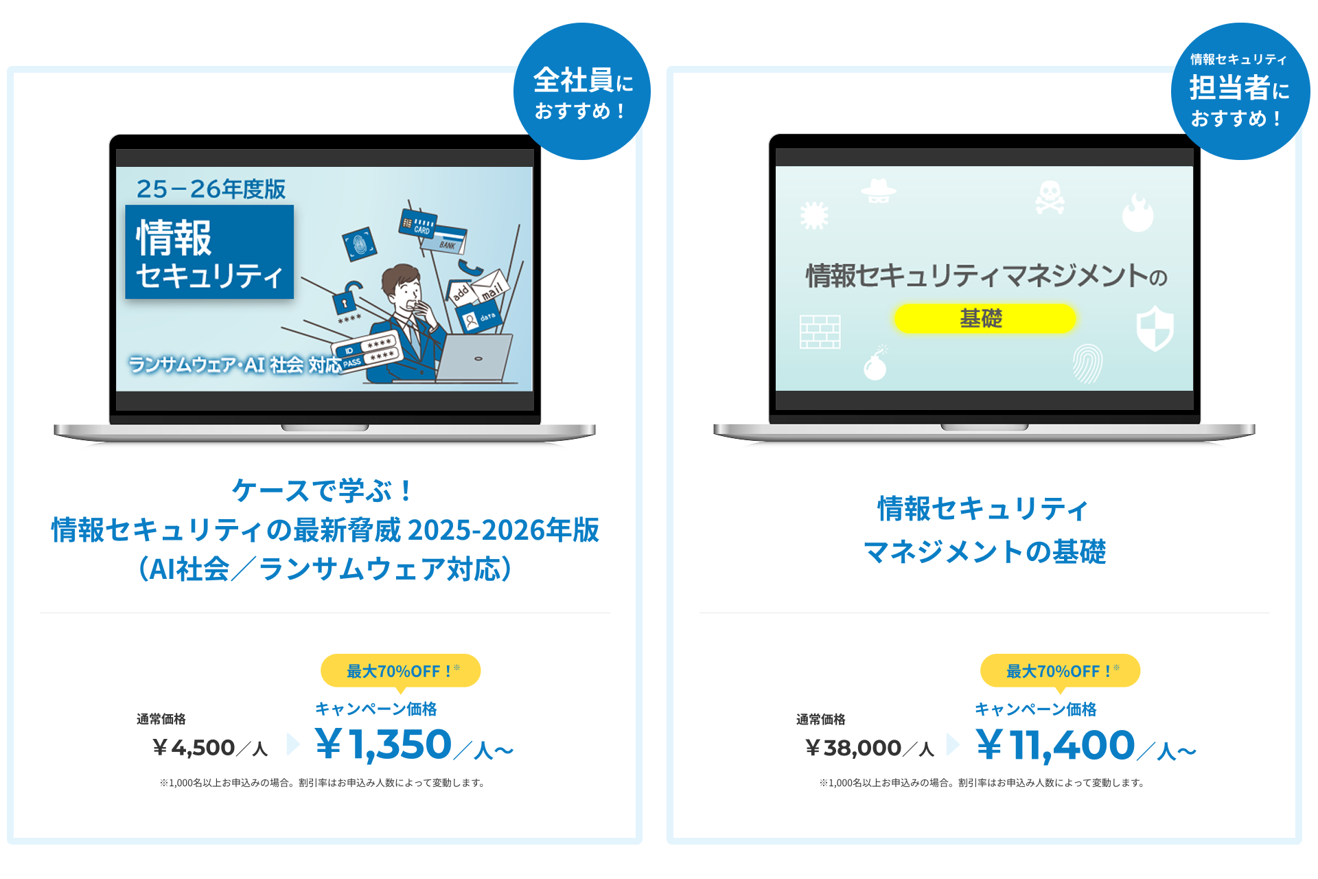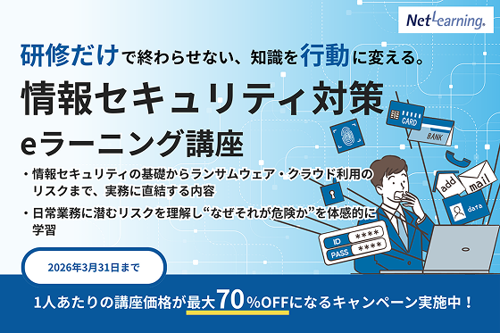 株式会社ネットラーニング(本社:東京都新宿区、代表取締役:岸田徹)は、2025年12月4日(木)より、企業向け情報セキュリティeラーニング2コースを対象にした最大70%割引キャンペーンを開始いたします。