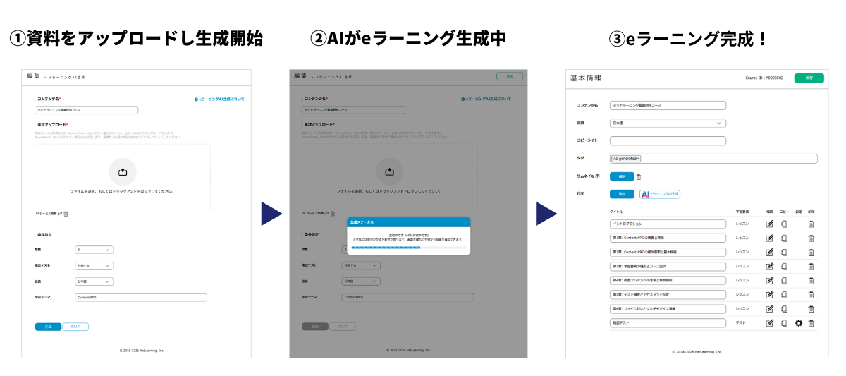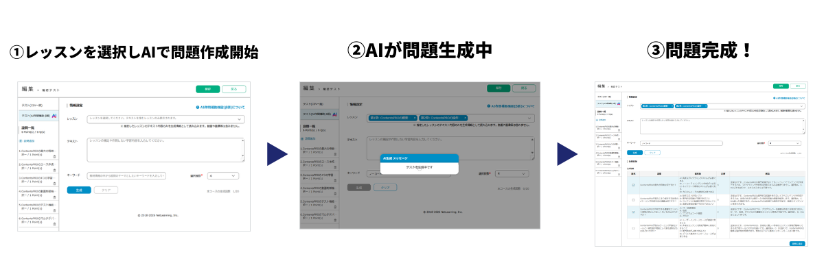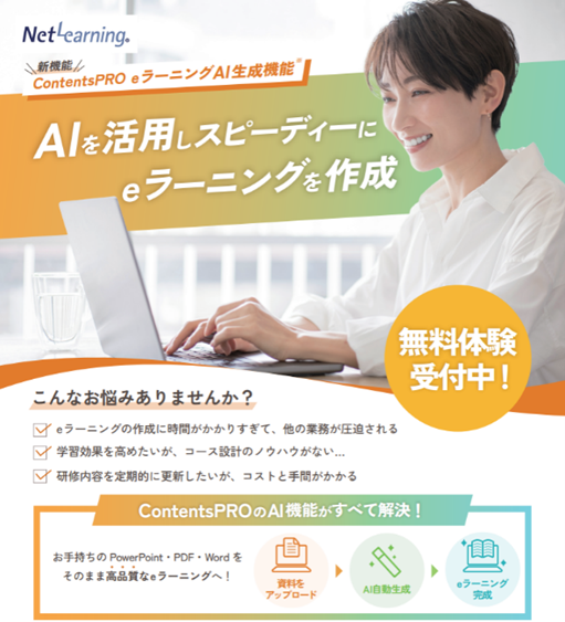 株式会社ネットラーニング(本社:東京都、代表取締役会長CEO:岸田努)は、累計導入社数7,569社、累計学習者数約1億1,750万人の実績を持つ教育サービスの提供を通じて培ったノウハウをもとに、eラーニングコンテンツ内製化サービス「ContentsPRO」において、AIを活用した新機能「eラーニングAI生成機能」を2026年4月14日に販売開始およびリリースいたします。また、既に提供中の「AI作問補助機能」との連携により、コンテンツ制作から問題作成までを効率化するAI支援環境を実現しました。