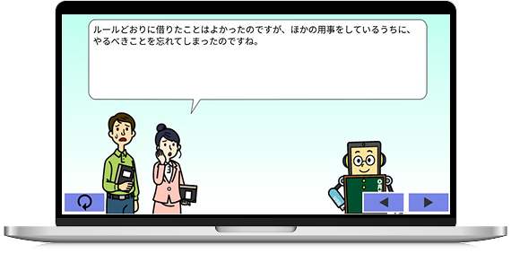 会話やディスカッション、アニメーションを活用することで、学習者が主体的に思考し、適切な行動を選択できるように導きます。