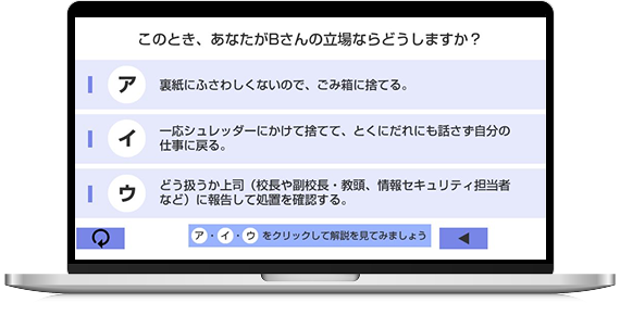身近なケーススタディを通した学習やセルフチェックを通じて、セキュリティ対策に対する当事者意識を醸成します。