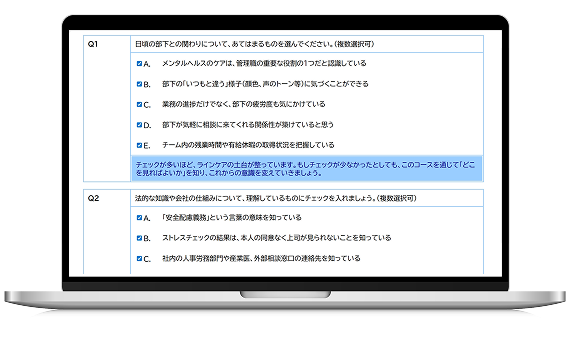 受講者に気づきを促す「セルフチェック」と「最終ワーク」を採用しています。第1章のセルフチェックでは、チームと部下の状態を振り返ることができます。第3章の最終ワークでは、実践的な課題を通して、管理職が行うべき適切な対処を考えます。