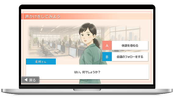 第2章では、プラスαのコンテンツとして、部下への声かけをシミュレーション形式で学ぶことができます。不調が予想される部下への自然な声のかけの方法やNG例を実践的に学びます。
