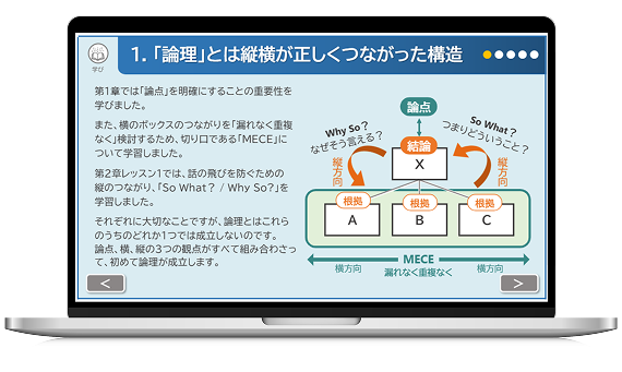 - 論点を正しく理解し、漏れなく重複なく(MECE)論理を組み立てることができるようになる