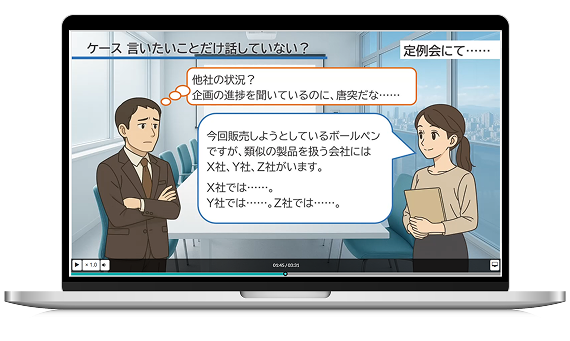 「言いたいことだけ話してしまう」「根拠が足りない」など、ロジカルシンキングのつまずきやすいポイントを、ケーススタディ動画で具体的に再現します。受講者は、客観的にNG例と成功例を比較することで、自身の思考の癖や課題に気づきやすくなります。各章のセルフチェックと組み合わせ、具体的な行動変容を促します。