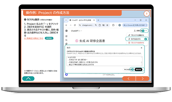 知識習得を重視した「気づき → 学び → クイズ → テスト → 演習 → 総合演習」の6ステップ構成を採用しています。インプットとアウトプットを繰り返す拡張的な学習設計により、ChatGPT-5の概要からProject機能、Agent機能の特性までを深く理解し、基本知識を確実に定着させます。