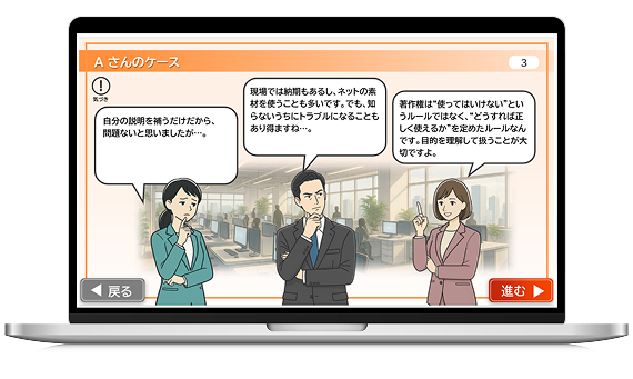著作権・知的財産・情報管理の3分野を通じて、ビジネス現場で求められる「正しく使い、正しく守る」判断力を養います。法令の趣旨を押さえつつ、日常業務での具体的な行動とリスク回避を実践的に理解。AIやネット素材など新しいテーマにも触れ、現場で迷わず対応できる知識を身につけます。クイズとケース事例で「なぜそうすべきか」を考え、学びを行動に結びつけます。複雑な法解説ではなく、現場での判断基準と信頼を守る視点を中心に構成。どんな職種でもすぐに役立つ、実務対応型のコンプライアンス学習です。