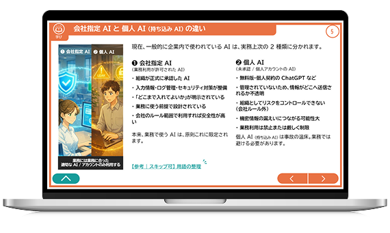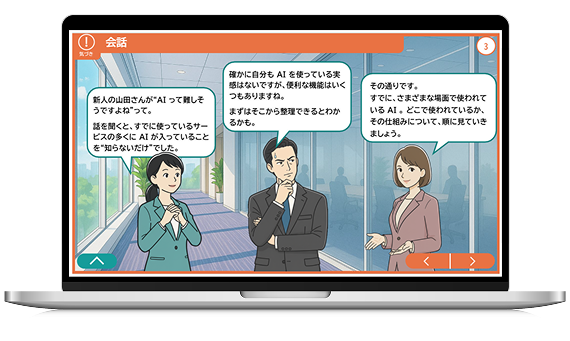 また、3名のキャラクターによる会話形式を採用することで、受講者が抱きやすい疑問や不安を自然に言語化し、シャドーAI利用の防止をふくむ情報セキュリティ面にも配慮した、企業研修向けの構成としています。