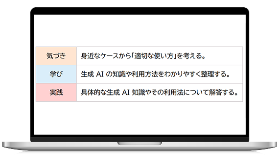 生成AIを万能な道具として扱うのではなく、人が考え、判断するための身近な業務アシスタントとして、安心して使い始められる状態を目指します。