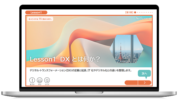 本講座は、「気づき(視点獲得)」→「学び」→「クイズ」→「テスト」→「演習」→「総合演習」という6つのステップで構成されています。IT基礎から実務ノウハウまで、インプットとアウトプットを体系的に繰り返すことで、ITへの苦手意識を克服し、DX推進に必要な知識とスキルを確実に定着させるための学習デザインです。