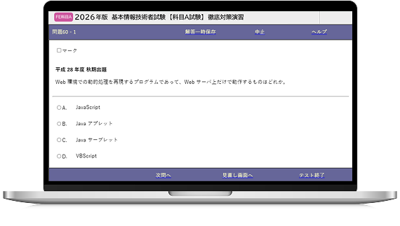 「基本情報技術者試験」に出題される各ジャンルの過去問題を解き、合格の目安となる60%の正答率を目指します。