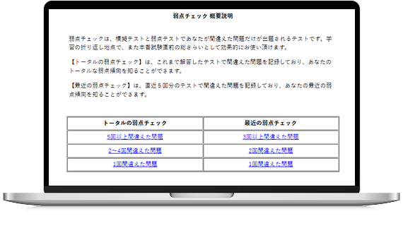 間違えた問題をまとめて復習できる「弱点チェック」機能を搭載しています。単に問題を解くだけでなく、自分の弱い領域を把握し、繰り返し学び直すことで知識を確実に定着させることができます。